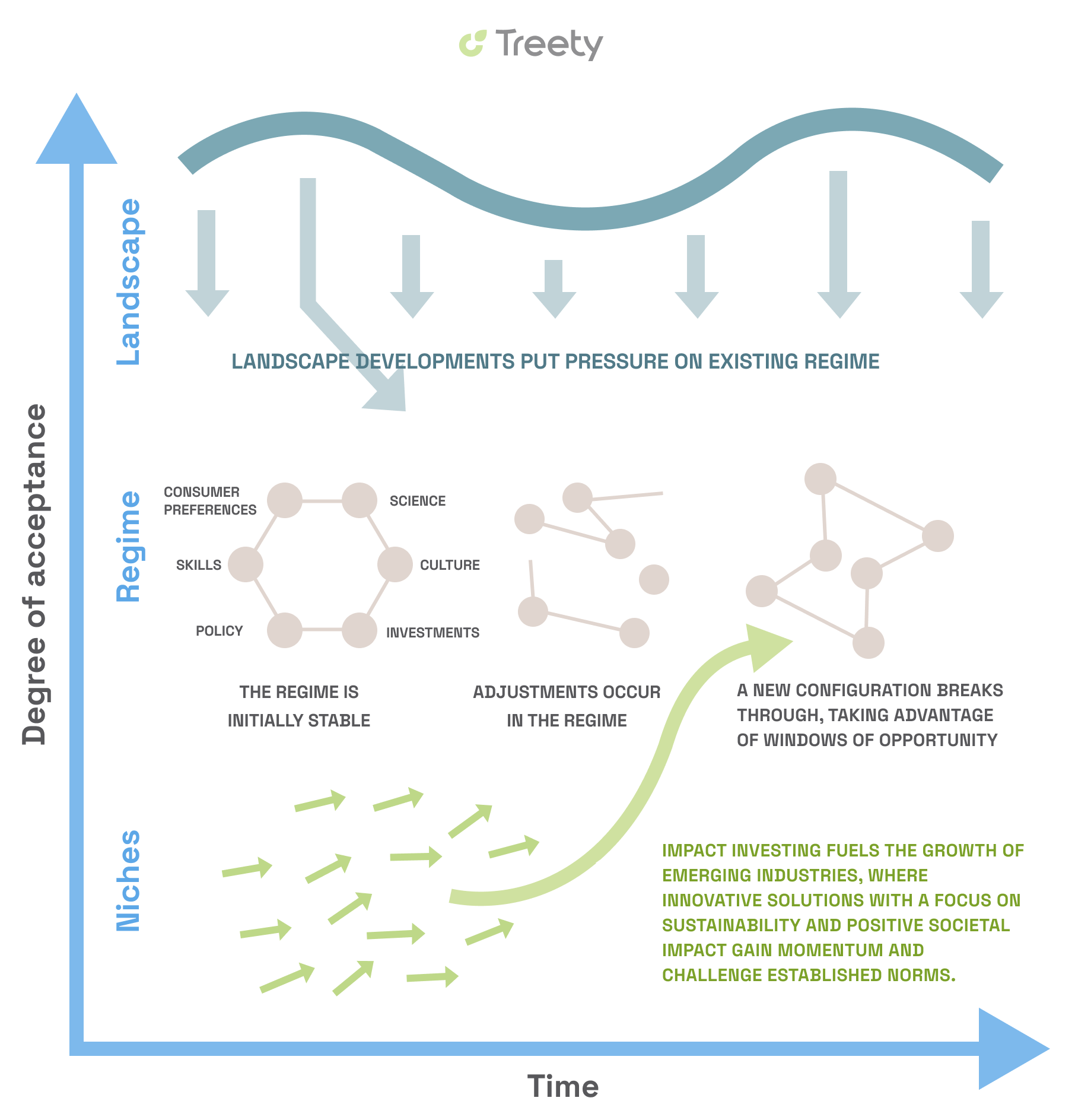 But what is the significance of impact investing in a broader sense and can it drive a systemic change? Indeed it can! This can be illustrated through the Multi-Level Perspective (MLP) theory, which describes socio-technical transitions, including sustainability shifts.
